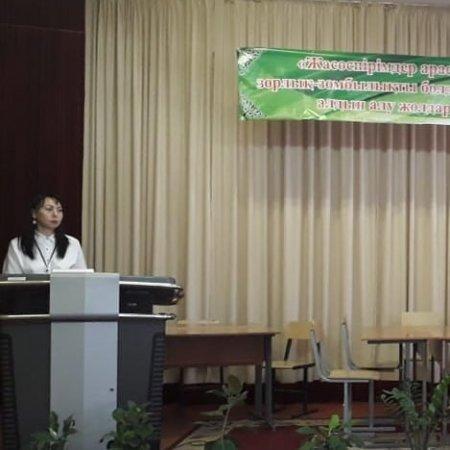 Жамбыл облысы Байзақ ауданы әкімдігінің білім бөлімінің Ыбырай Алтынсарин орта мектебінде " Жасөспірімдер арасындағы зорлық- зомбылықтың алдын алу жолдары" тақырыбында Николай Гоголь атындағы орта мектебінің педагог- психологы " Жасөспірімдер арасындағы зорлық- зомбылықтың кибербуллинг турі" тақырыбында Абильдаева Шынар баяндама оқып, видеоролик көрсетті.